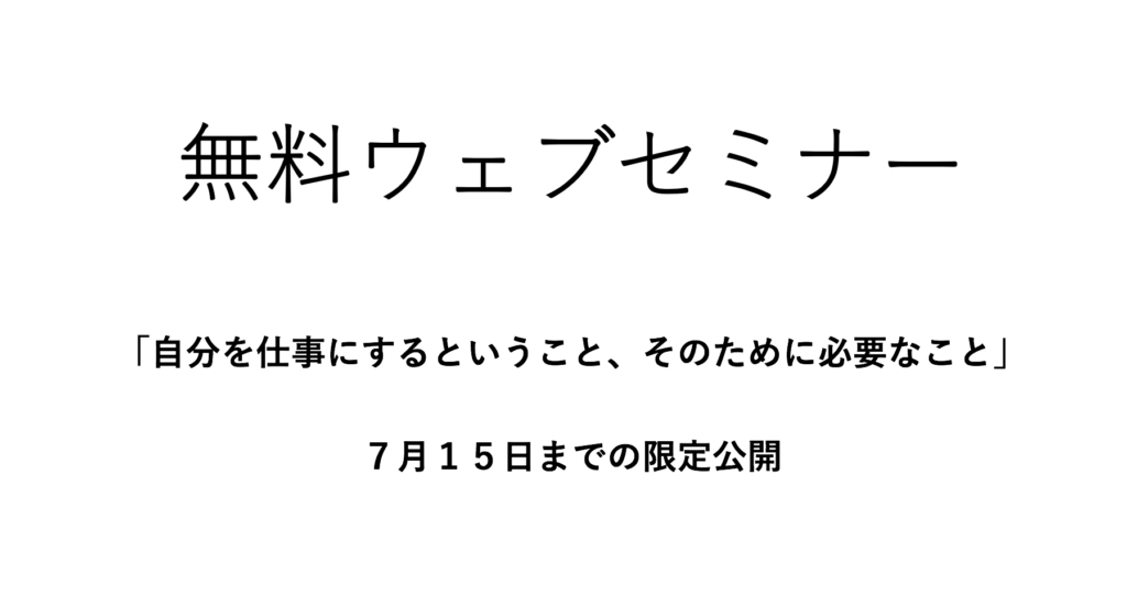 無料ウェブセミナー 【自分を仕事にする、ということ そのために必要なこと】 視聴をご希望の方は、下記ページよりお名前(フルネーム・姓名)とメールアドレスをご記入ください。 自動返信メールが送付されます。携帯のキャリアメールではこちらからのメ...